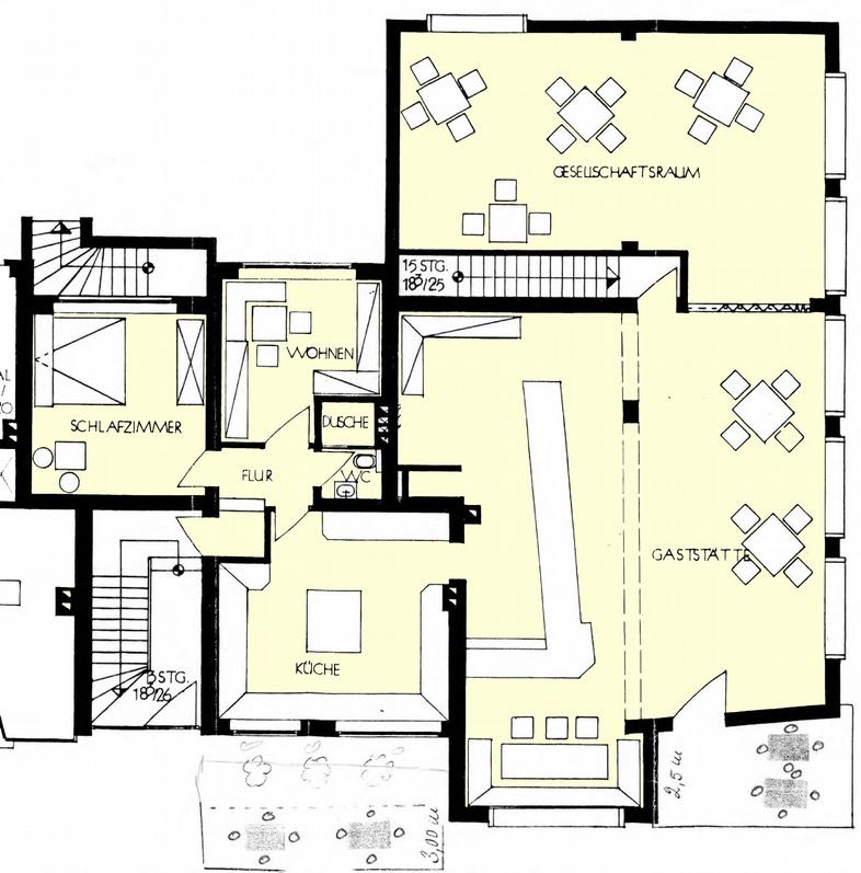 Die Wohn-/Nutzfläche der Wohnräume bträgt rd. 34 qm, die Gaststätte hat eine Gewerbefläche von rs. 185 qm.