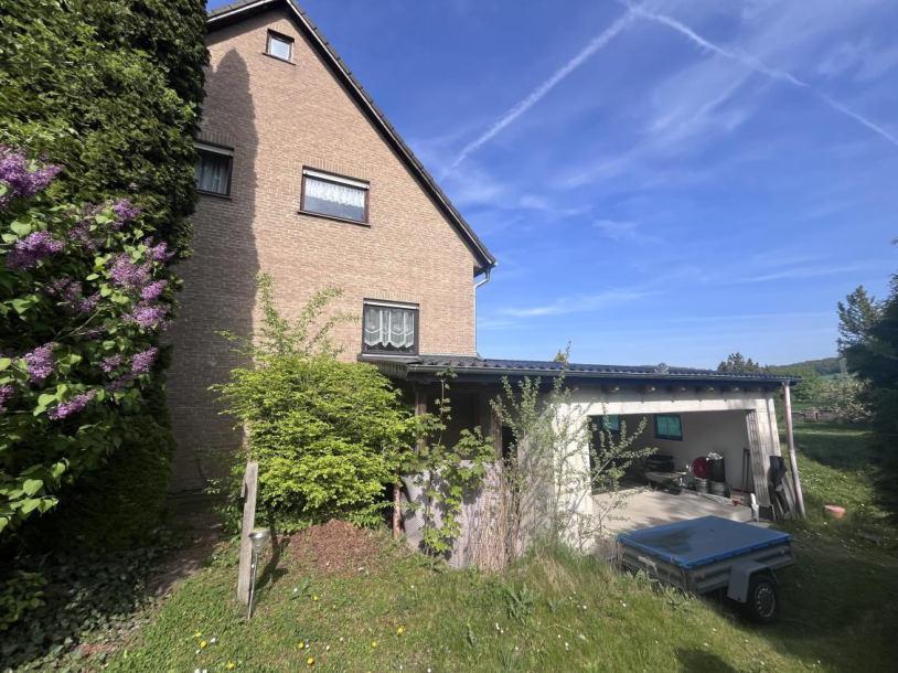 Eingeschossiges, unterkellertes Einfamilienhaus mit ausgebautem Dachgeschoss sowie einem eingeschossigen Garagenanbau mit leicht geneigtem Satteldach.