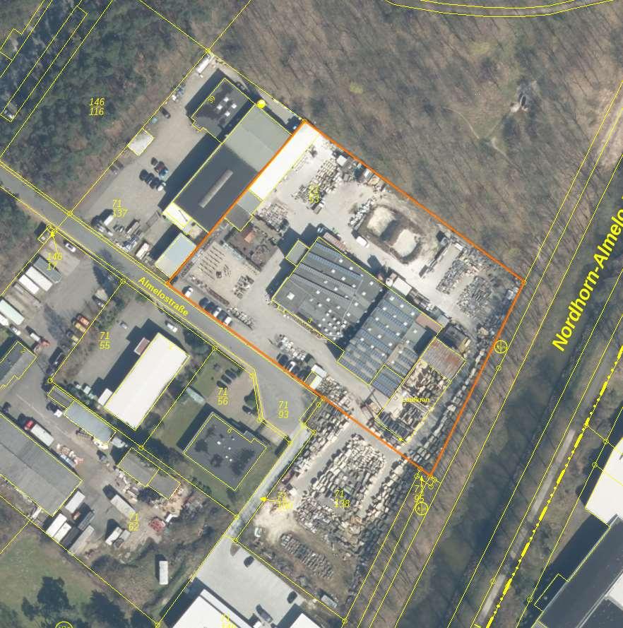 Grundstück bebaut mit Produktionshalle mit Büro-/Ausstellung und Sozialbereich und Nebengebäude: Neubau Büroraum, Werkstatt, Geräte und Lagerhalle (BV Nr. 1 Blatt 19227) nebst unbebautes Grundstück (BV Nr. 1 Blatt 25826)